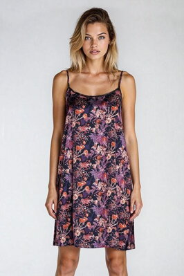 Saténová košilka s oblíbeným květinovým vzorem na tmavě modrém pozadí.