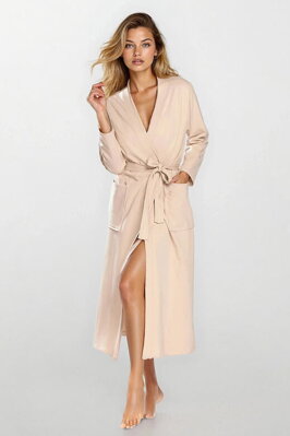 Krásný bavlněný župan má béžovou barvu v odstínu latte, je dlouhý a...