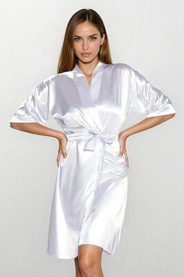 Saténový župan Trixa má jasně bílou barvu, je krátký a má...