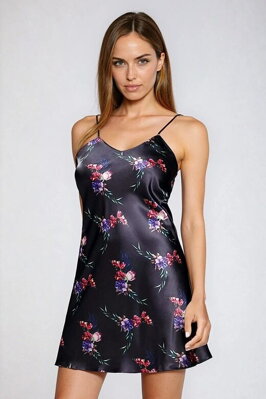 Dámská košilka Karen z kolekce značky Dkaren, z kvalitního jemného saténu s decentním květinovým vzorem na tmavě modrém pozadí.