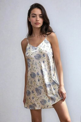 Saténová košilka s modrým květinovým vzorem na bílém pozadí.