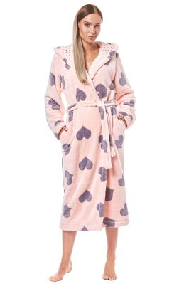 Příjemně měkoučký huňatý župan s kapucí v lososové barvě s fialovými srdíčky.