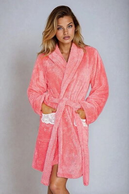Huňatý dámský župan s ozdobnou krajkou na kapsách.