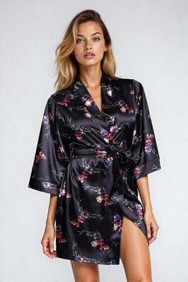 Saténový župan s jemným květinovým vzorem v délce cca 90 cm.